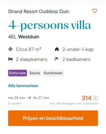NederlandMidden in een prachtig duinlandschap vinden jullie de huisjes van Landal Strand Resort Ouddorp Duin. Op dit park valt voor zowel jong als oud meer dan genoeg te beleven! Ga het strand op voor een fijne wandeling of huur een fiets en trek de duinen in. Zin in wat ontspanning en entertainment? Ga heerlijk dineren bij Restaurant bij Marc en geniet daarna van een mooie voorstelling in Strandtheater de Houten Kaap. Dit wordt maximaal genieten!
