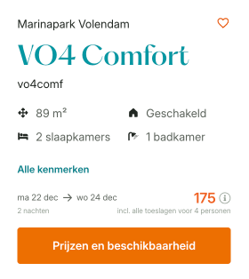 NederlandOntdek het pittoreske Volendam tijdens een verblijf op Marinapark Volendam! Dit kleinschalige vakantiepark is volledig gebouwd in de kenmerkende Volendamse stijl en ligt direct naast het dorp. Je kunt dus lopend alle hotspots ontdekken! Het park heeft overigens een prachtige locatie aan de jachthaven van Voledam en beschikt onder andere over een binnenzwembad, meerdere restaurants, een fietsverhuur en een kleine supermarkt. Ga jij binnenkort Volendam ontdekken?