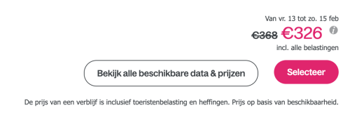 Disclaimer: deze prijs is exclusief heffingen en verplichte toeristenbelasting (op basis van het aantal personen en aantal nachten).