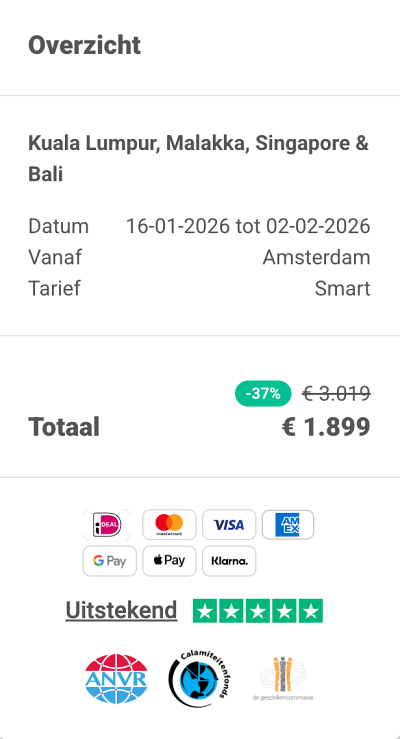 BaliStadslichtjes, jungle vibes en het strandleven? Ja, graag! Je begint je rondreis in Maleisië en Singapore, waar je wordt verwelkomd door schitterende skylines en kleurrijke neonlichten. Twin Towers in Kuala Lumpur? Check! Daarna ga je door naar Malakka: een mix van culturen, historie en overheerlijk streetfood. Je volgende stop is Bali waar je in Ubud tussen de groene rijstvelden en tropische jungle duikt. En dan? Vroeg opstaan voor de hike naar de top van Mt. Batur waar je over lavagesteente en onder de sterrenhemel naar een zonsopgang loopt die je nooit zult vergeten. Na al die actie ga je verder naar Sanur voor zand onder je voeten en zon op je huid. Let’s go!